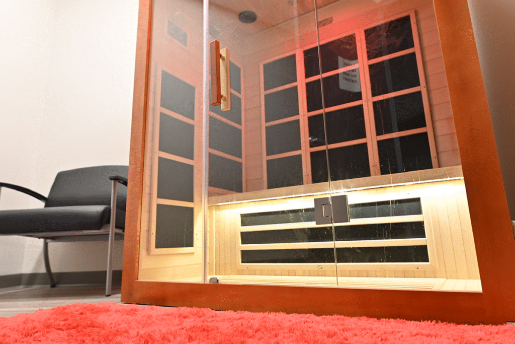 Our sauna is an infrared red light sauna designed to support recovery at a deeper level than traditional heat alone. Infrared heat penetrates the body more directly, helping promote circulation, muscle relaxation, and recovery while placing less stress on the body.